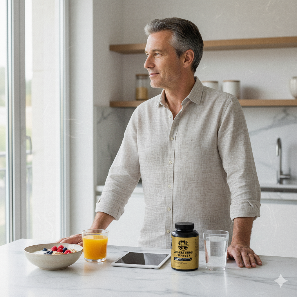Cholesterol Complex GoldNutrition® é uma fórmula, desenvolvida para apoiar a regulação do metabolismo lipídico. Combina quatro ingredientes cientificamente comprovados: esteróis vegetais (Lipophytol®), que reduzem a absorção do colesterol LDL; berberina, que ajuda a baixar o colesterol e os triglicéridos; e monacolinas de arroz vermelho fermentado.